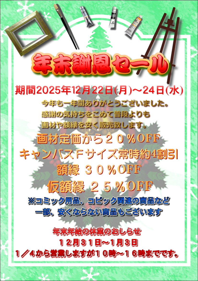 額・勲記額・デッサン額や油絵用品・水彩用品・コミック用品・コピック全色の販売をしています。