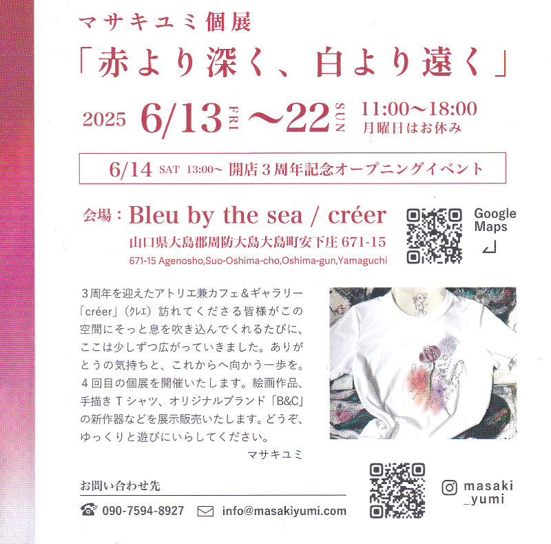 マサキユミ個展「赤より深く、白より遠く」が周防大島のBleu by the sea/creerで開催されます